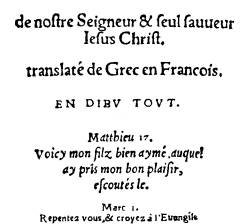La bonne coutume a obtenu de toute ancienneté que ceux qui mettent en avant quelque livre en public le viennent à dédier et présenter à quelque Prince, Roy, Empereur ou Monarque, ou s'il y a majesté plus souveraine... Aucuns ont bien telle prudence et égard que leurs inventions ne seraient pas bien reçues du peuple, si elles ne portaient la livrée de quelque très illustre, très excellent, très haut, très puissant, très magnifique, très redouté, très victorieux, très sacré, béatissime et sanctissime nom. Pourquoi avoir eu le tout bien considéré et vu courir et trotter tous les autres écrivains et translateurs, l'un deçà, l'autre delà, l'un à son Mecénas libéralissime, l'autre à son Patron colendissime, l'autre à son je ne sais quel Révérendissime : je ayant en main cette présente translation de la Bible, n'ay pas tant fait pour icelle dame coutume... que je me sois voulu asservir et assujettir au droit qu'elle exige et requiert..... Aussi ne lui appartient-il point (à ce livre) faire du parasite quelque glorieux Thraso qu'il rencontre. Car il est bien d'autres étoffes que tous autres livres quels qu'ils soient, les auteurs desquels en font offrandes si profitables et méritoires et si cauteleux échanges contre riches dons et plantureux octrois. Après lesquelles bêtes je ne chasse point, car je me passe bien de tel gibier, la grâce à Dieu qui me fournit de contentement et suffisance.