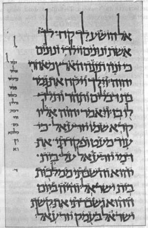 Partie d'une colonne du Codex Babylonicus (voir point 24.2.5 du texte global = point 1.2.5. de la Partie 4 «Les textes originaux et les traductions anciennes»). Les points-voyelles sont au-dessus des lettres. C'est le système supralinéaire, dit babylonien, plus simple et probablement plus ancien que le système sublinéaire, ou palestinien. Le fac-similé ci-dessus représente le passage Osée, 1 v. 2-5, depuis : à Osée, va prends.....
